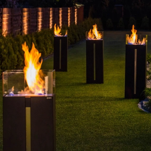 Die Ethanol-Kamine des renommierten Kaminherstellers kratki verbinden höchste Ansprüche an Sicherheit und Qualität mit modernem Design und einer sauberen, rauchfreien Verbrennung. So kann auf umweltfreundliche Weise ein spektakulärer, flammender Blickfang in jedes Ambiente integriert werden. Das freistehende Bodenmodel ROMEO setzt mit seiner eleganten, säulenartiken Optik mit ganz und gar schnörkelloser Linienführung einen eindrucksvollen, flammenden Akzent in Ihrer Raum- oder Terrassengestaltung. Mit seinem markanten, geradlinigen Design und dem modernen Brenner mit perfekter, lückenloser, 25 cm langer Feuerlinie verströmt ROMEO sanfte Wärme und zaubert nach dem Entzünden im Handumdrehen eine wundervolle, behagliche Atmosphäre. 5 Paneele aus gehärtetem Sicherheitsglas dienen der Abschirmung des Feuers und sorgen für ein zusätzliches Plus an Sicherheit. Gleichzeitig unterstreicht die Verglasung die noble Anmutung des Ethanolkamines. Die Flamme lässt sich individuell regulieren und bei Bedarf kinderleicht löschen. Praktisch ist die integrierte Füllstandsanzeige. Zudem ist in den Brenner eine Spezialkammer mit absorbierendem Einsatz integriert, welche ein Verschütten von Ethanol bei versehentlichem Überfüllen verhindert und darüber hinaus den Brennstoffbedarf reduziert.