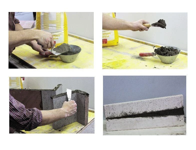 Jeweils nur die gewünschte Menge Wasser in der Maurerpfanne unter Zugabe von Haftmörtel gut durcharbeiten, bis eine plastische Masse entsteht. Größere Mengen in einem sauberen Kübel mit einem Rührwerk durcharbeiten.