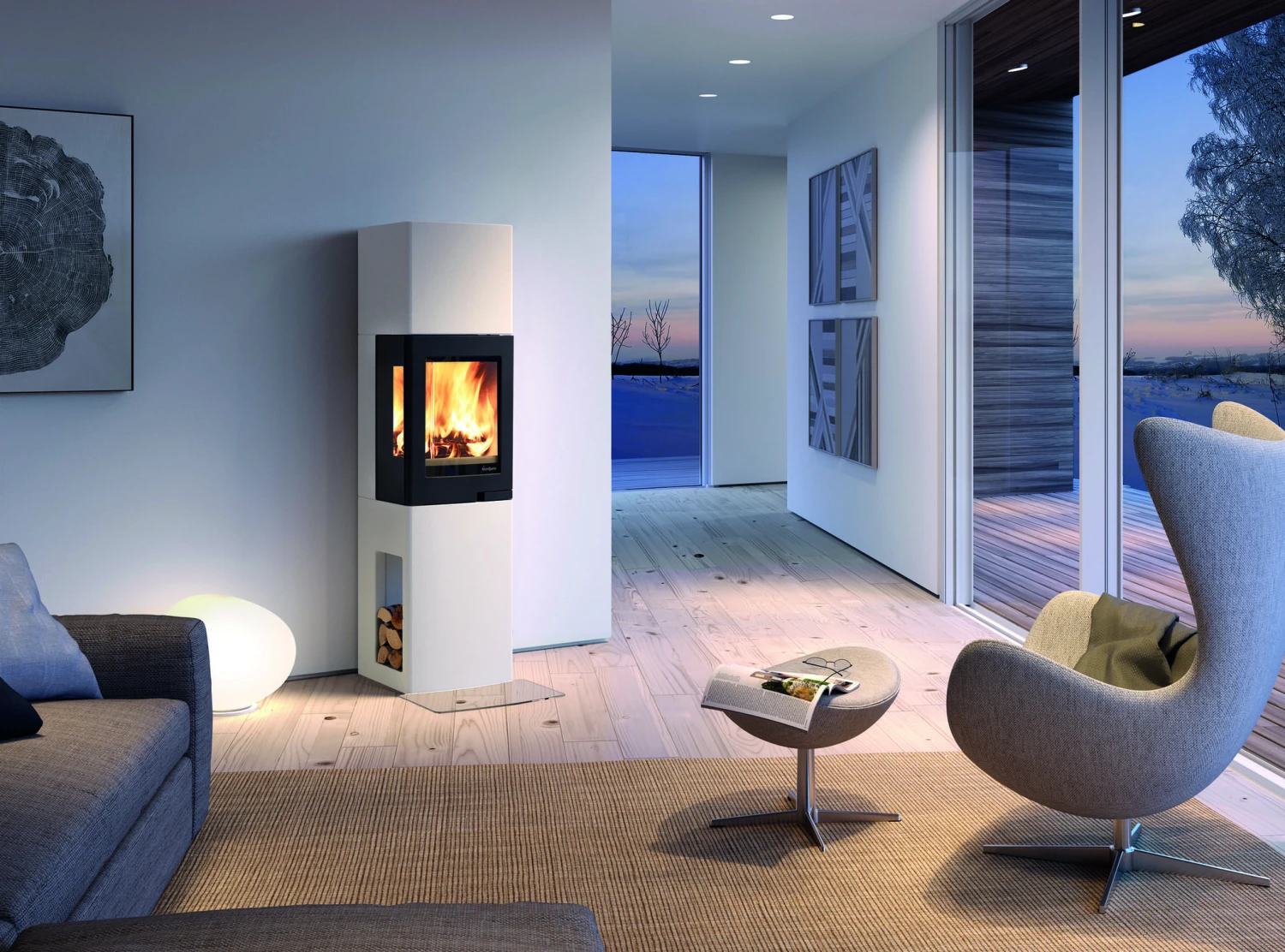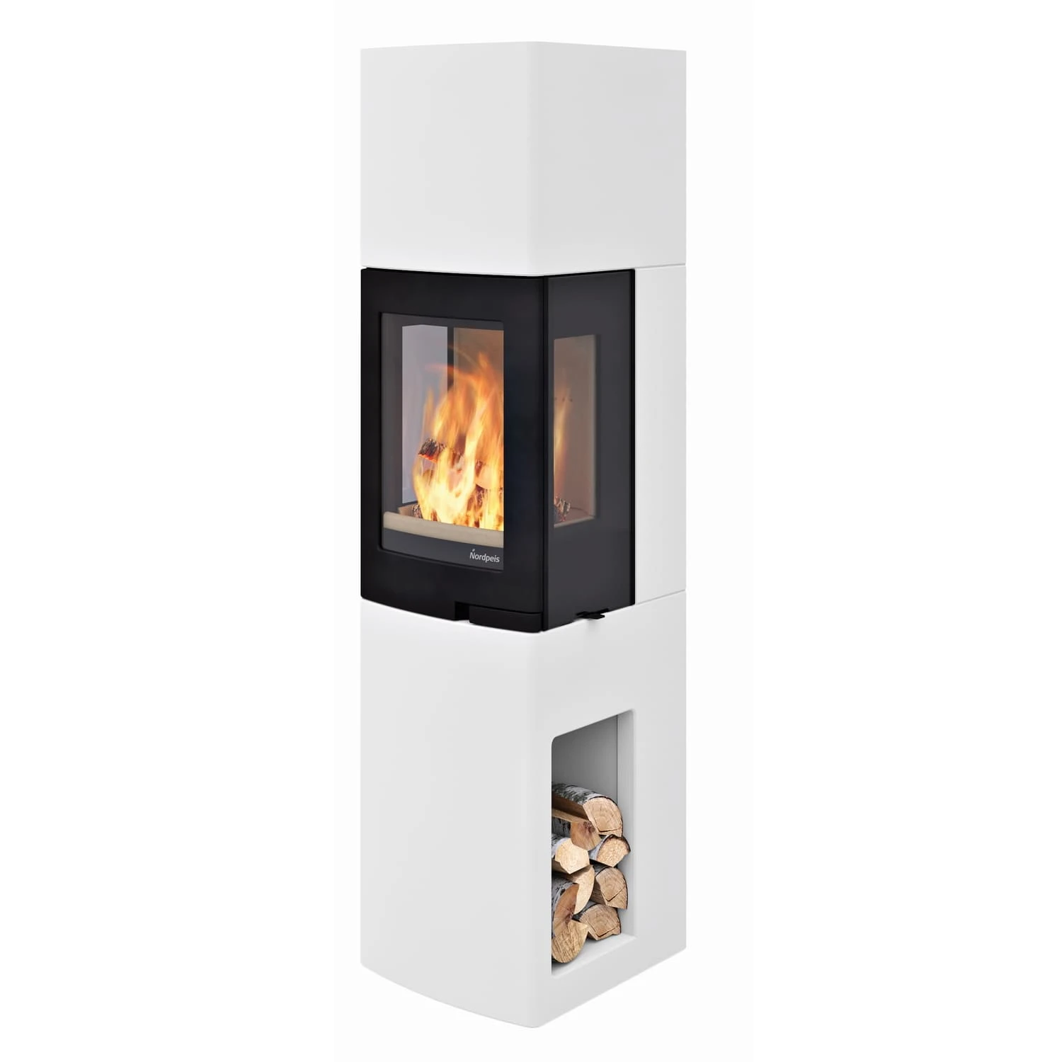 Die Kaminbausätze des norwegischen Herstellers Nordpeis überzeugen durch moderne Designs im angesagten Skandinavischen Stil, den Einsatz hochwertiger Materialien und große Produktvielfalt sowie mit kinderleichtem Aufbau. Der Korpus des Kaminbausatzes Lisboa wird gefertigt aus Spezialbeton, dem sogenannten Shape Stone Light, dessen hohe Haltbarkeit und Festigkeit durch eine, in den belasteten Bereichen sogar verstärkte, Faserarmierung erlangt wird. Das Material hat eine leichte Speicherwirkung und sorgt so auch nach dem Abbrand für eine angenehme Strahlungswärme, dank welcher ein nachhaltig wohlig-warmes Raumklima geschaffen wird. Bei dem Kaminbausatz Lisboa handelt es sich um einen Bausatz für einen 3-Seiten-Kamin mit geringer Grundfläche, ausgezeichnet geeignet auch für Räume mit wenig Platzangebot, und großzügiger 3-seitiger Verglasung, was ihn innerhalb des Interieurs zu einem aufsehenerregenden Blickfang der ganz besonderen Art macht. So wird ein besonderer Platz mit viel optischem Charme geschaffen, der auf wunderbare Weise gemütliche Wärme und Wohnlichkeit verströmt. Bei der Gestaltung des Lisboa lag der Fokus auf einer klaren Linienführung sowie auf der spektakulären Sicht auf das herrlich prasselnde Kaminfeuer in seinem Inneren, erlangt durch die großen Panoramascheiben, die aus beinahe jedem Blickwinkel einen spektakulären Blick auf das herrlich prasselnde Kaminfeuer in seinem Inneren freigeben. Besonders praktisch ist das integrierte Holzfach im rechten, unteren Segment. So kann der Brennholzvorrat stets griffbereit und gleichzeitig stilsicher aufbewahrt werden. Der graue Spezialbeton kann darüber hinaus für eine individuelle Gestaltung mit einer Ofenfarbe in Ihrem Wunschfarbton angestrichen werden. Der Anschluss des in diesem 3-Seiten-Kamin verbauten Kamineinsatz Nordpeis S-18U kann ganz flexibel oben oder hinten vorgenommen werden.