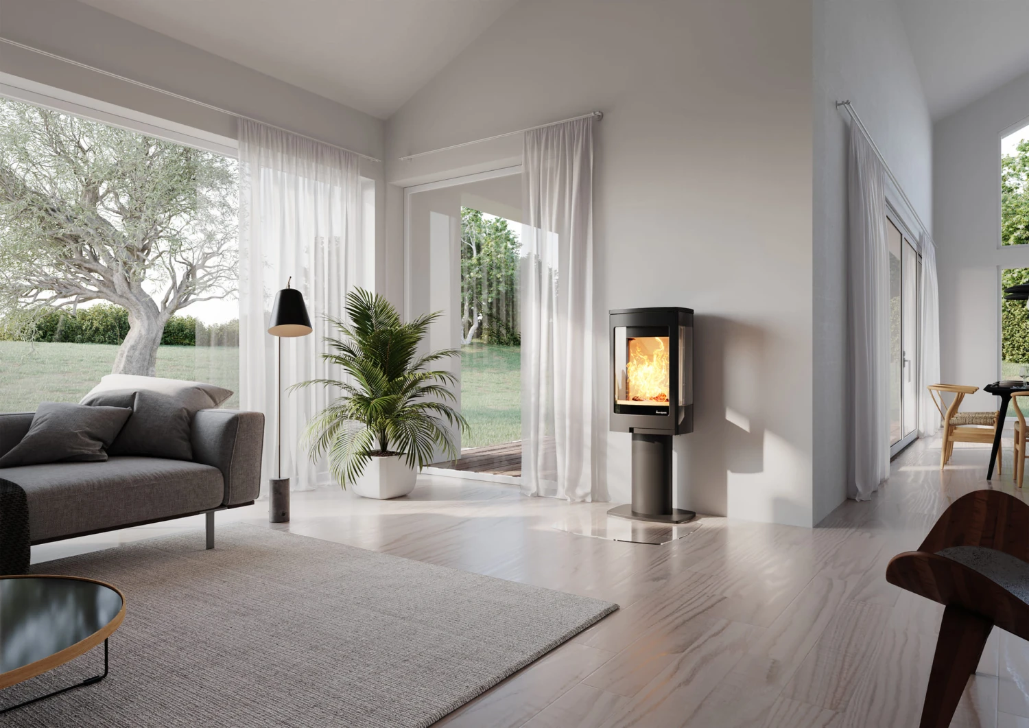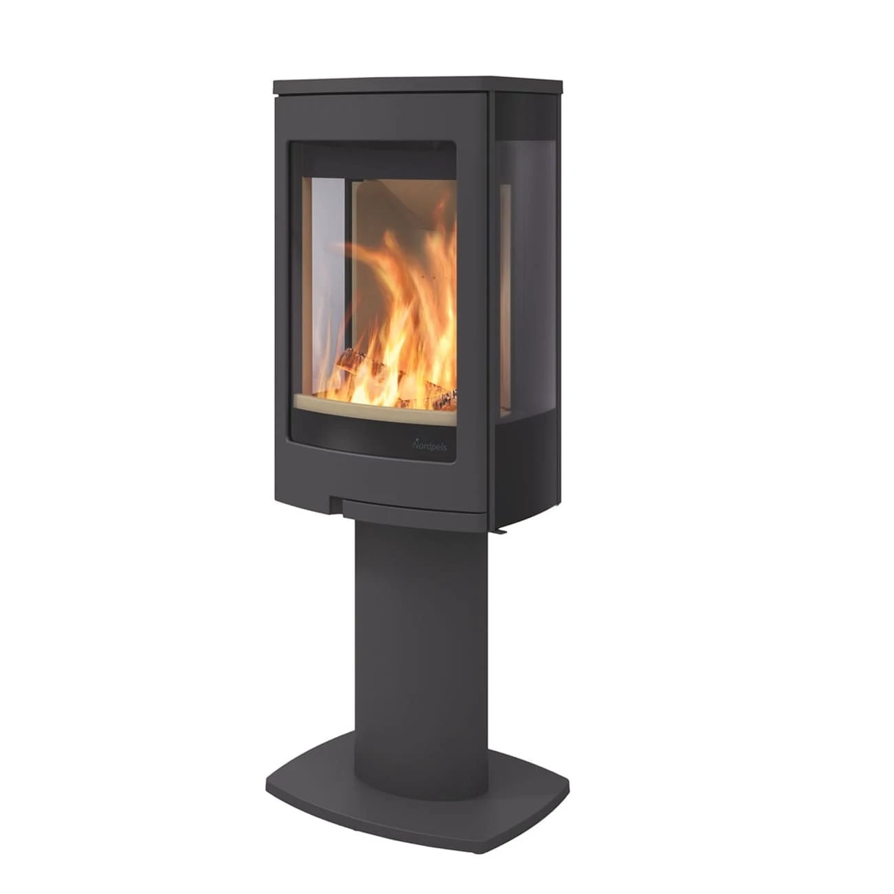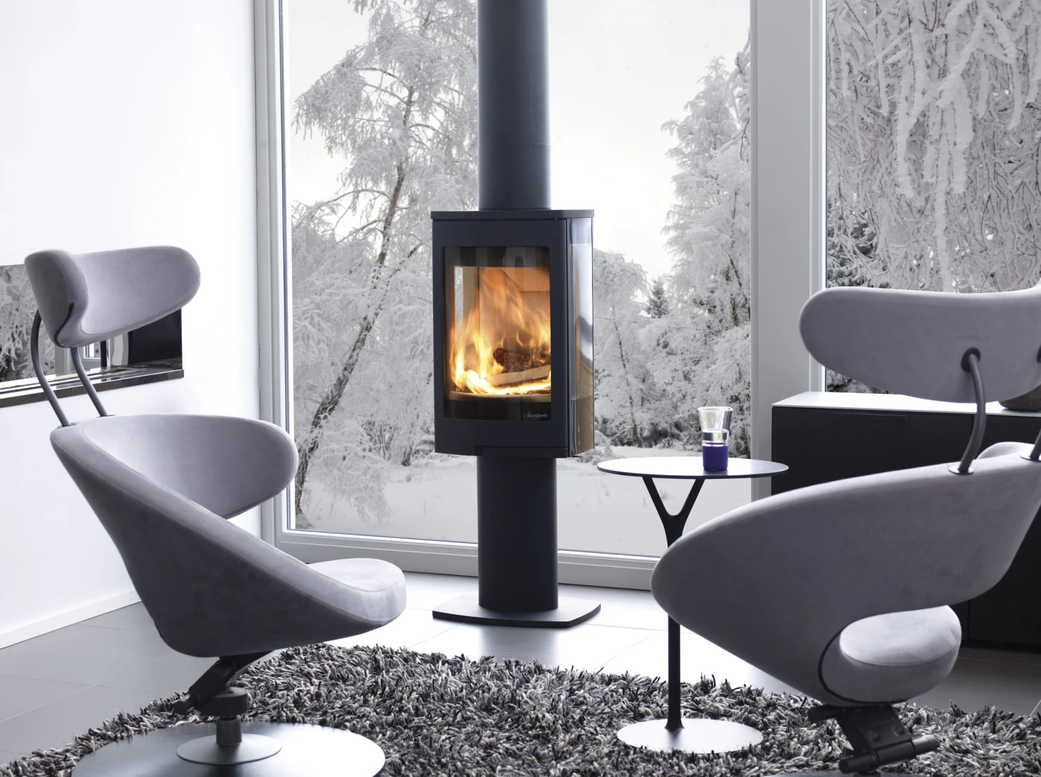 Die Kaminöfen des norwegischen Herstellers Nordpeis überzeugen durch moderne Designs im angesagten Skandinavischen Stil und den Einsatz hochwertiger Materialien. Der Kaminofen Duo 1 lässt sich dank seiner kompakten Abmaße besonders gut in kleine bis mittelgroße Räume integrieren. Dank der gekonnt subtilen und doch einprägsamen Linienführung integriert sich dieser Kamin spielend in jede Art von Interieur. Der Korpus des Kamines wird gefertigt aus hochwertigem, in elegantem Schwarz lackiertem Stahl. Extravagantes Highlight des Duo 1 sind die seitlichen Sichtscheiben, die den Blick des Betrachters in den Feuerraum auch aus ungewohnten Blickwinkeln freigeben. So wird auf besonders raffinierte Weise eine wunderbar wohnliche Atmosphäre geschaffen. Der schlanke Sockel ergänzt gekonnt das stilvolle Design und unterstreicht das optisch höchst ansprechende Erscheinungsbild des Duo 1.