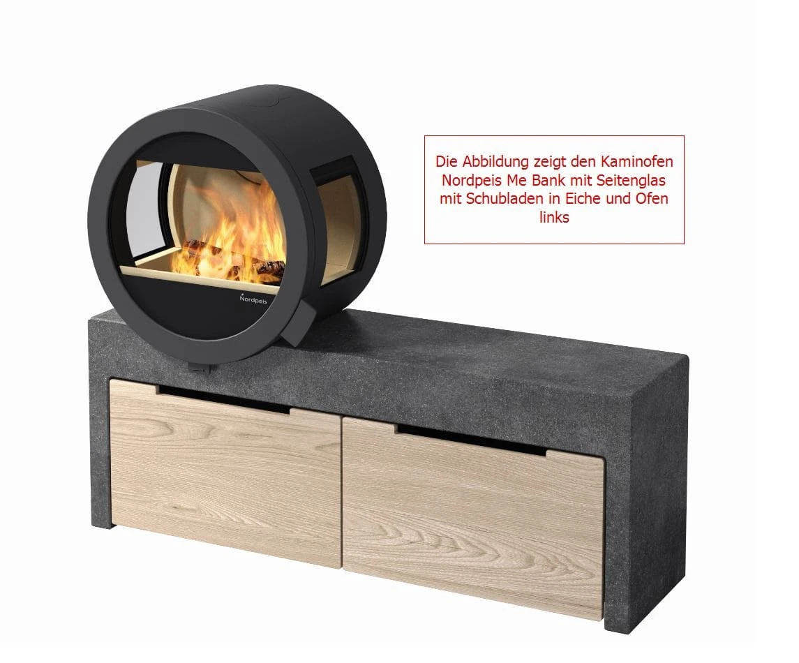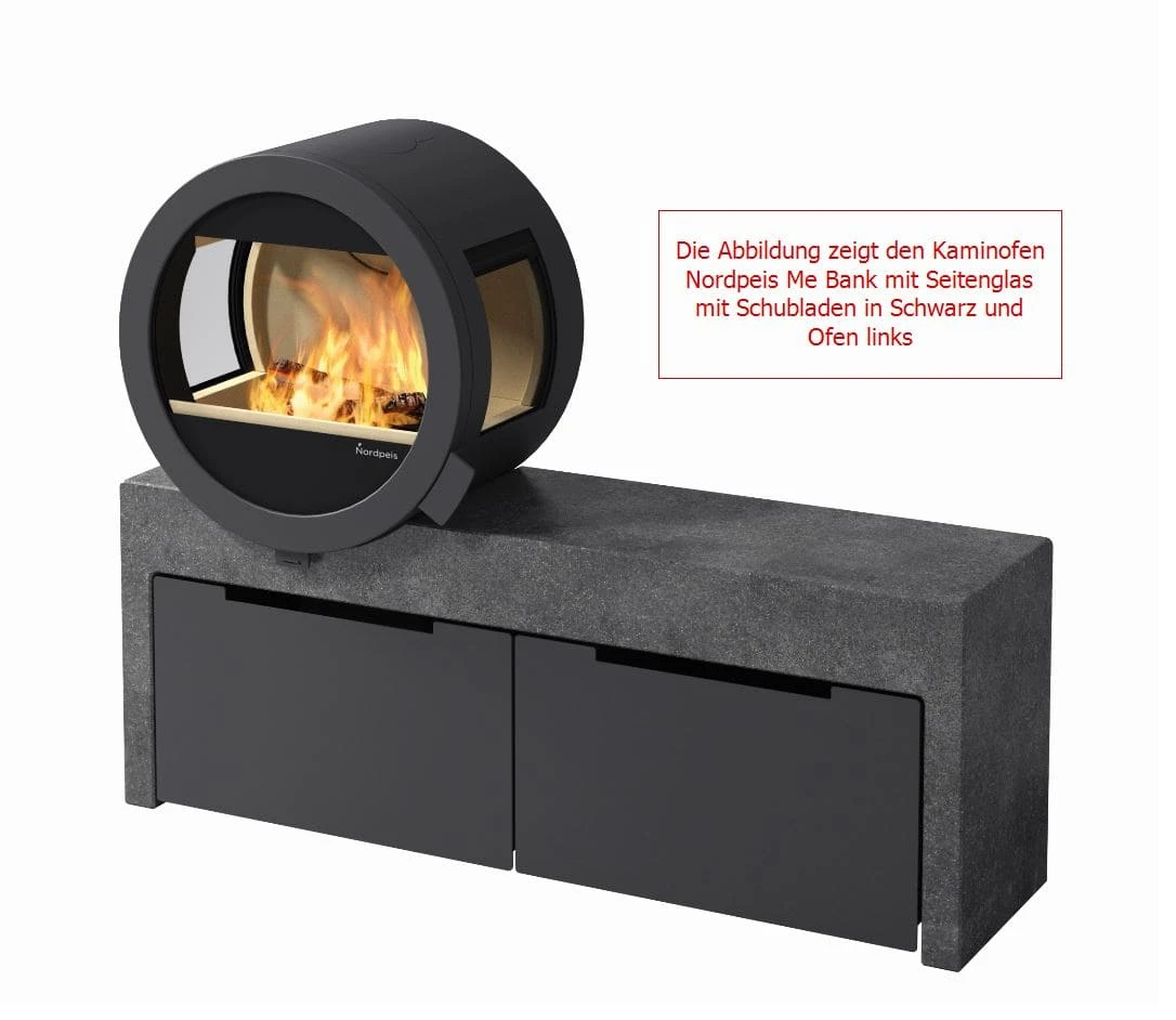 Die Kaminöfen des norwegischen Herstellers Nordpeis überzeugen durch moderne Designs im angesagten Skandinavischen Stil und den Einsatz hochwertiger Materialien. Beim Kaminofen Me Bank handelt es sich um einen Kaminofen mit einzigartigem Charakter und innovativem Design. Die Brennkammer überzeugt mit Ihrer großzügigen, wahlweise ein- oder 3-seitigen Verglasung, die den Blick des Betrachters auf das wunderbar prasselnde Kaminfeuer in seinem Inneren freigibt. Die Bank, auf welcher die Brennkammer wahlweise rechts oder links montiert wird, kann als Holzablage genutzt und auf Wunsch mit praktischen Schubladen ausgestattet werden, die beispielsweise als Aufbewahrung für Untensilien wie Kaminanzünder oder den Brennholzvorrat dienen können. Mit seiner charakteristischen Formgebung und der hochwertigen Lackierung in elegantem Schwarz akzentuiert der Me Bank auf aufsehenerregende Weise jedes erdenkliche Interieur.