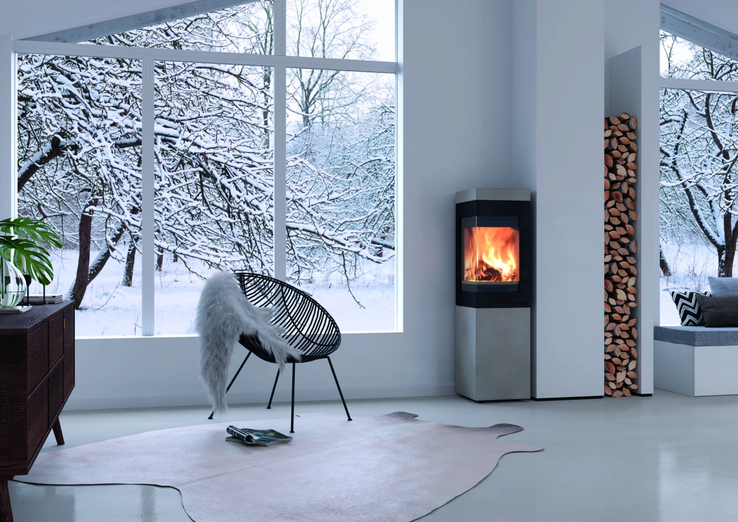 Die Kaminöfen des norwegischen Herstellers Nordpeis überzeugen durch moderne Designs im angesagten Skandinavischen Stil und den Einsatz hochwertiger Materialien. Der Kaminofen Quadro Basic Colorado wird mit seiner Höhe von ca. 1,40 m und der großzügigen Eckscheibe zum unübersehbaren optischen Highlight in Ihrer individuellen Raumgestaltung. Der Quadro ist für die Platzierung innerhalb vieler Raumkonstellationen eine ausgezeichnete Wahl, denn durch seinen besonderen Grundriss und seine klappbare Eckglastür lässt sich dieser Schwedenofen perfekt in eine Raumecke positionieren, aber auch direkt vor eine Wand stellen, so dass Sie aus allen Blickwinkeln das lebendige Feuerspiel in seinem Inneren genießen können. Der Korpus des Eckkamines ist aus Colorado, einem hochwertigen, durchgefärbten, gewachsten und polierten Spezialbeton in der Farbe Natur gefertigt. Eine Topplatte aus dem gleichen Material rundet die Optik des Kaminofens perfekt ab.