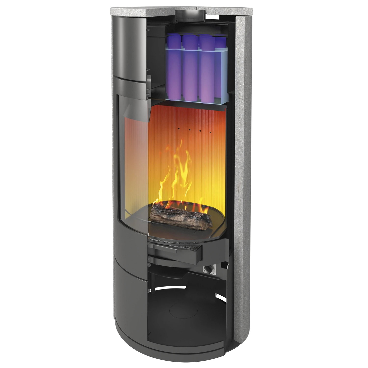 Natürlich nicht direkt, sondern nur bildlich. Das herrliche Kaminfeuer erwärmt das kalte Wasser aus dem Pufferspeicher über den im Kaminofen integrierten Wasserwärmetauscher. Anschließend wird das erhitzte Wasser an den Pufferspeicher zurückgeschickt. Danach kann die Wärme im Haus dezentral entweder über den Heizkörper, über die Fußbodenheizung oder auch beim Baden oder Duschen genutzt werden. Zusätzlich zur Wärmeaufbereitung des Wassers gibt der Kaminofen eine wohlige Strahlungswärme an den Aufstellraum ab.