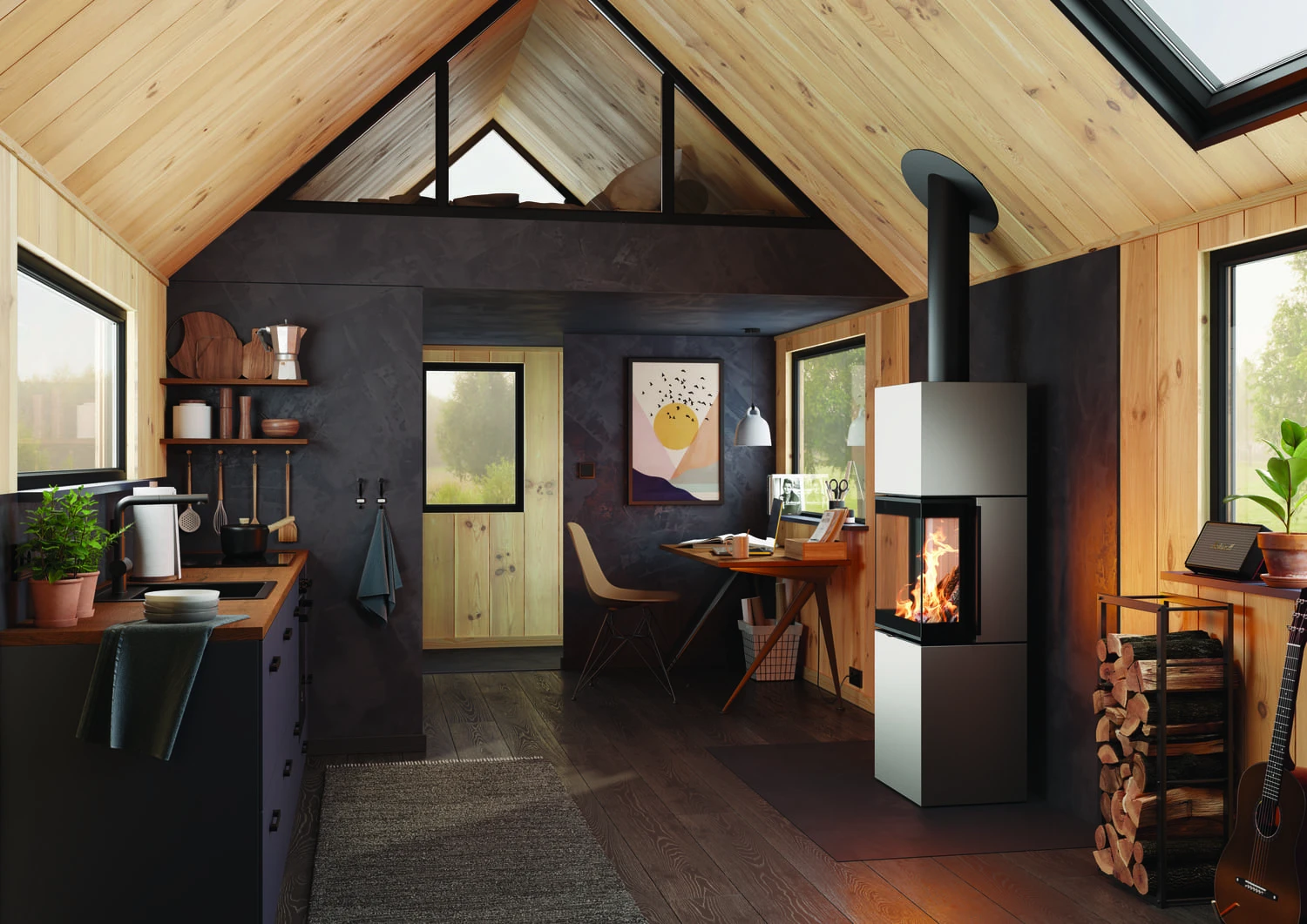 Bei der Gestaltung der Kaminöfen der Serie Trico des deutschen Premiumherstellers Spartherm lag der Fokus der Designer auf maximaler Feuersicht. Mit seiner großzügigen und besonders hohen, hinsichtlich Effizienz und Sauberkeit der Scheiben während des Abbrandes optimierten, 3-seitigen Infrarotverglasung erlauben die Trico Kaminöfen dem Betrachter eine spektakuläre Sicht auf das in seinem Inneren lodernde Kaminfeuer – und das aus nahezu jeder erdenklichen Perspektive. Dank der quadratischen Grundform mit nur 40 cm Breite und seiner moderaten Bauhöhe von ca. 1,50 m ist der Trico S ein idealer Kaminofen auch für kleine Räume oder Tiny Houses, denen es jedoch nicht an Behaglichkeit und wohliger Wärme fehlen soll. Das klare, geradlinige Korpus-Design lässt sich spielend mit Interieur in jedweder Stilrichtung kombinieren.